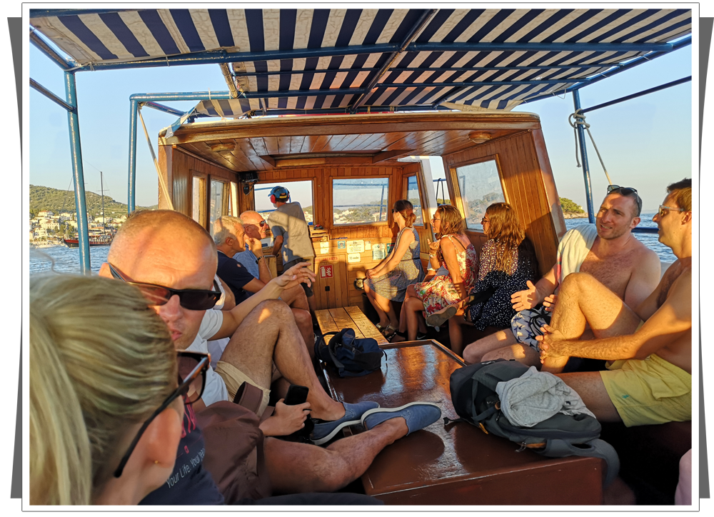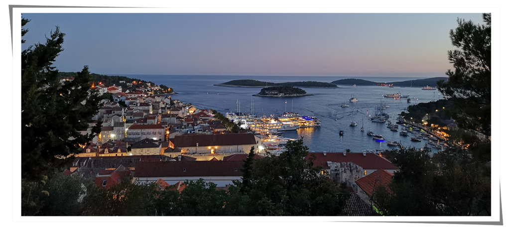 Na Hvarze jest bardzo rozwinięta sieć taksówek wodnych. Ponieważ miasto ma tylko malutki porcik, nie ma szans, żeby w nim zacumować. Wszystkie jachty więc cumują na pobliskich wyspach, a na zwiedzanie i wieczorne imprezowanie docierają do Hvaru taksówkami wodnymi, które kursują do późnych godzin nocnych. Tak zrobiliśmy i my: Po krótkim odpoczynku, zebraliśmy się i wyruszyliśmy taksówką wodną, prowadzoną przez Antonia. Byliśmy pod wielkim wrażeniem patrząc na jego umiejętności, zwłaszcza w drodze powrotnej. |