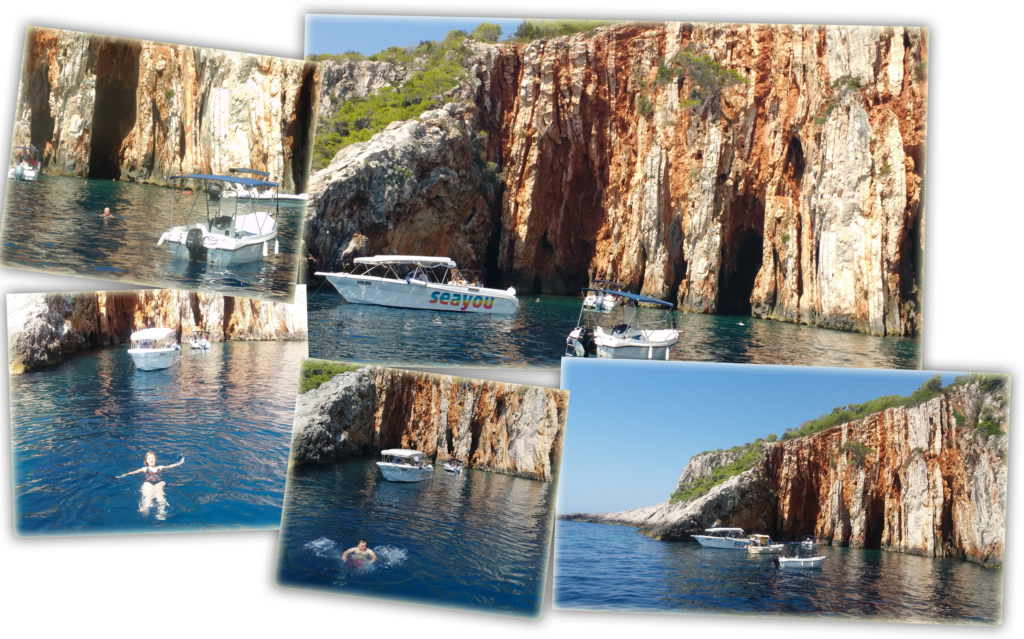 | Płynęliśmy wzdłuż wyspy Hvar, naszym pierwszym postojem był zatoka wprost wymarzona dla lubiących nurkowanie. Red Rocks to piękne wysokie skały. W pełni okazałości widać je tylko od strony morza. Są tam dwie groty, do których można wpłynąć wpław. Zatrzymaliśmy się wśród innych jachtów i motorówek, kapitan dał sygnał do kąpieli. Kto chciał mógł podpłynąć do grot, a kto nie chciał, mógł się po prostu zanurzyć w wodzie przy jachcie. | |