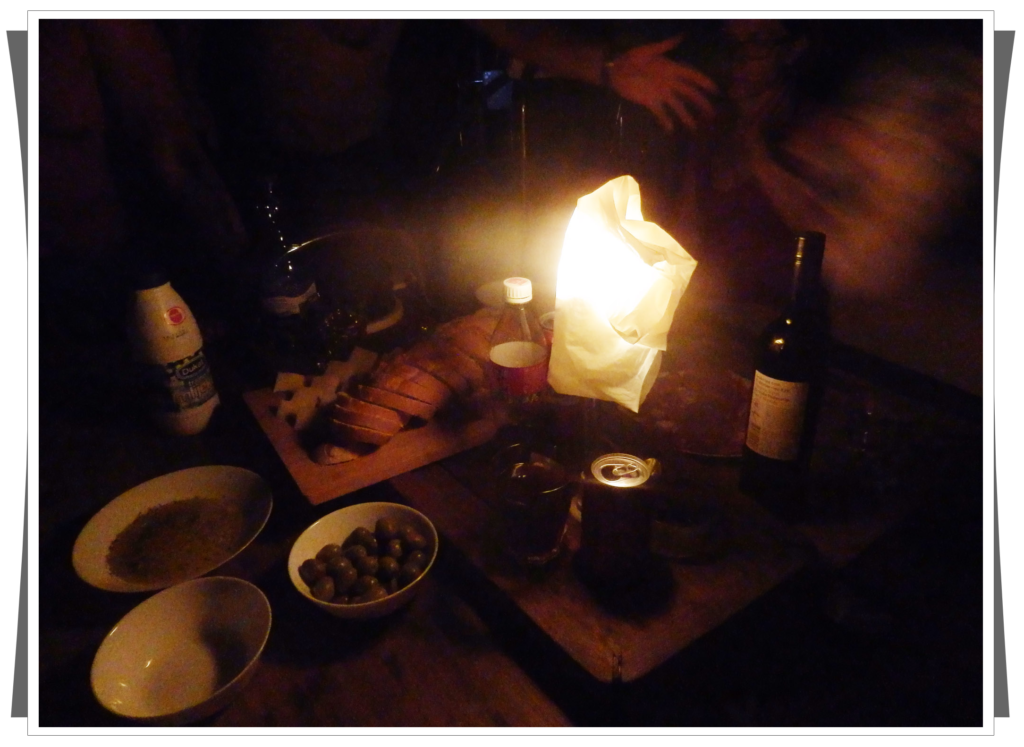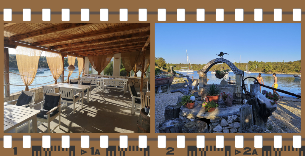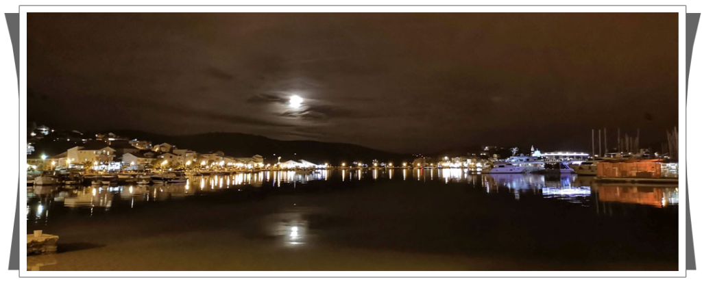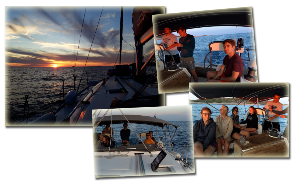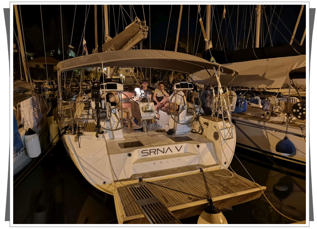 Pozostał nam jeszcze powrót na jacht. Ponieważ było już ciemno pływanie małym pontonem były zbyt niebezpieczne i długo by trwało, postanowiliśmy wrócić taksówką wodną. Tak, Chorwaci także świadczą takie usługi 🙂 Tomek pokazał na mapie miejsce, gdzie stał przycumowany nasz jacht, utargowaliśmy godną cenę za tą usługę i już płynęliśmy, zastanawiając się jak właściciel taksówki nas wysadzi na nasz jacht. To było naprawdę niesamowite, pan sprawnie dobił do naszego jachtu, który Paweł oświetlił, żeby łatwo było trafić i po chwili już siedzieliśmy w kokpicie delektując się regionalnymi specjałami. |