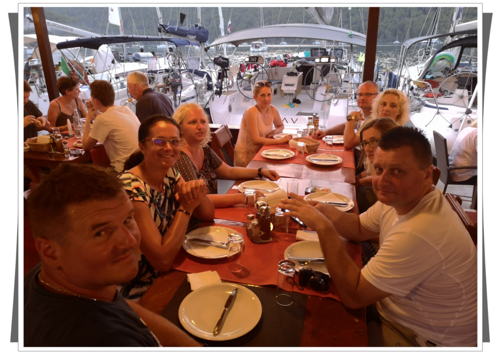 Na końcu zatoki znajdowały się klimatyczne restauracje, ale gdy Paweł pojechał na rekonesans, okazało się, że wszystkie miejsca są już zarezerwowane i zostało nam zjeść kolację na jachcie. |
