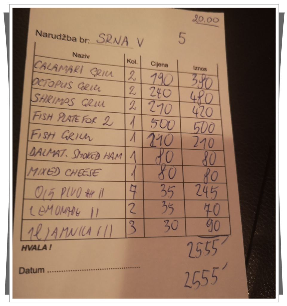 I w końcu udało się, aż nie mogliśmy uwierzyć w nasze szczęście, które trwało do czasu otwarcia kart. Ceny nas po prostu zmroziły – 100 KN (około 60zł) za piwko, to zdecydowanie za dużo. I już było wiadome, skąd te wspaniałe wolne miejsca. |