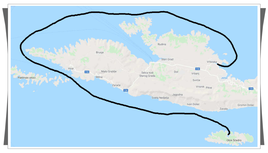 | Wypłynęliśmy wcześnie, bo czekała nas długa trasa. Zaplanowaliśmy dzisiaj nocleg na dziko, czyli w jakiejś przytulnej zatoczce. Wybór padł na wyspę Šćedro w zatoce Lovišće.