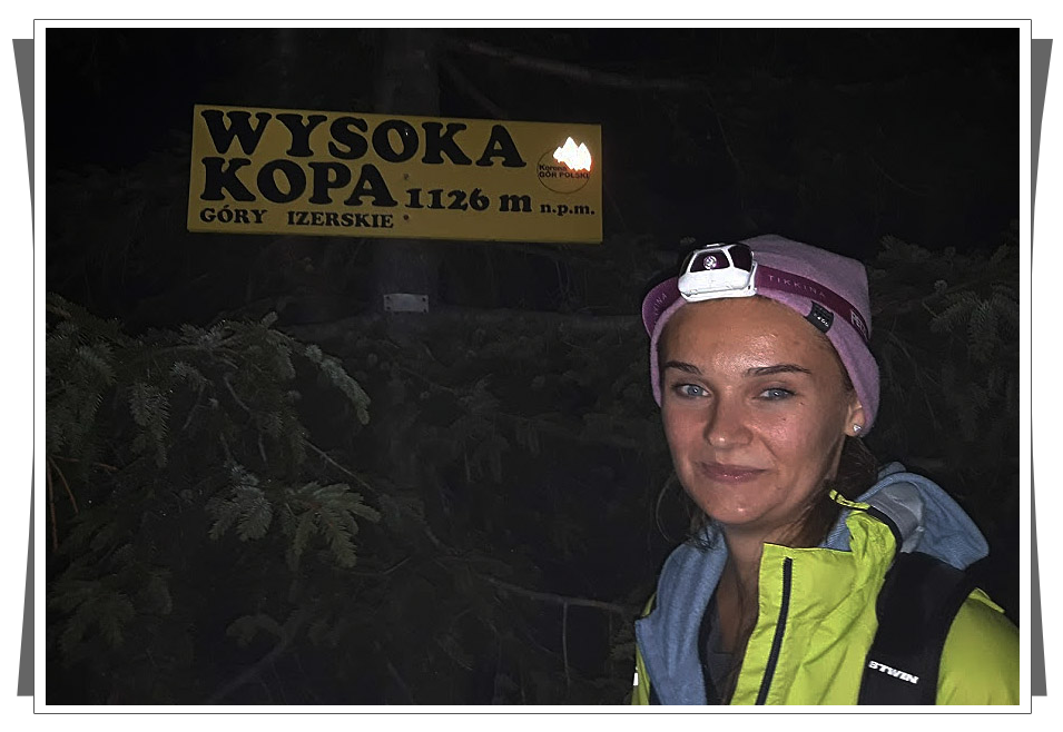 | Dosyć szybko zrobiło się ciemno jak to w październiku, jednak nie chciałyśmy zrezygnować, więc parłyśmy naprzód. Kiedy już myślałyśmy, że do szczytu niedaleko, okazało się, że trasa znowu prowadzi w dół. Poszukiwania szczytu przeprowadziłyśmy już w zupełnej ciemności. Ale udało się. Renia zaliczyła kolejny szczyt z KGP. | ![]() |