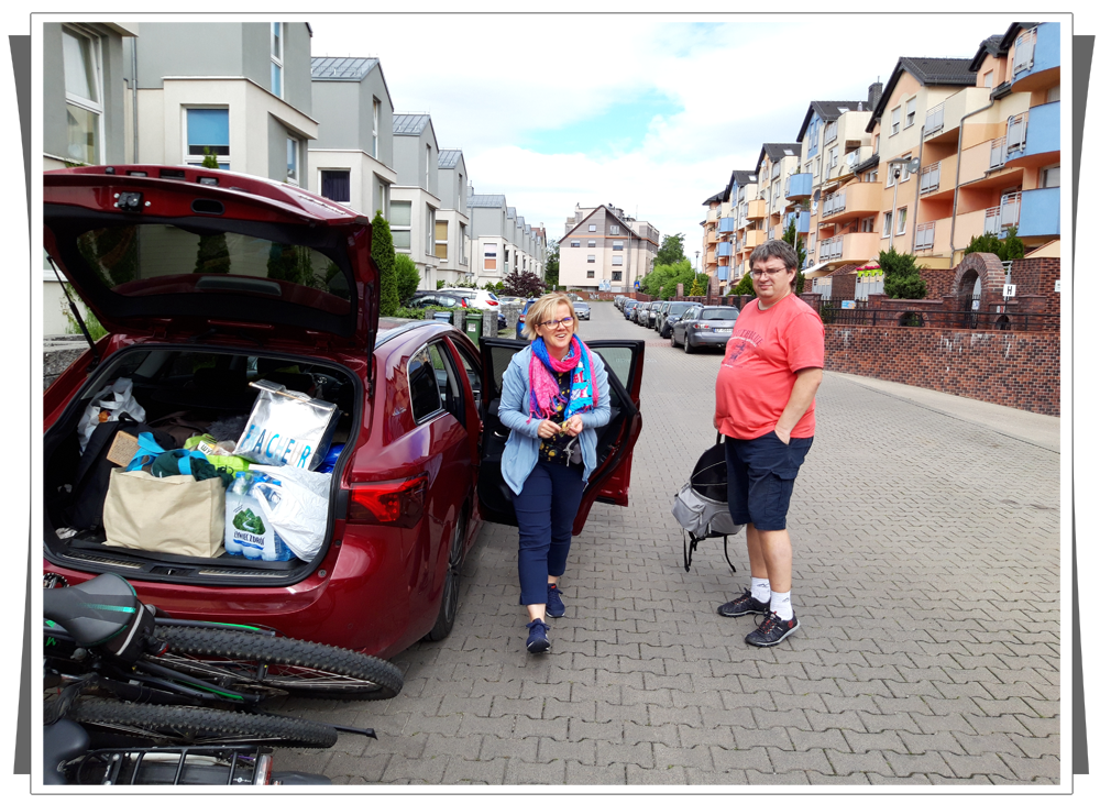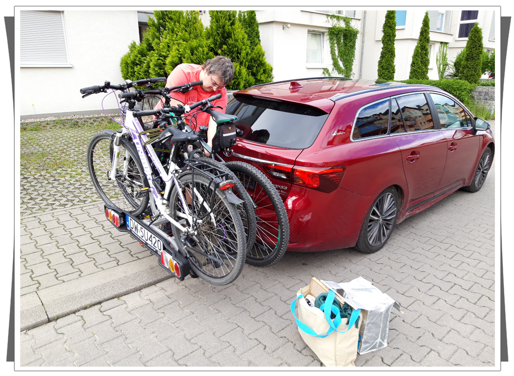 | Widać, że dawno nigdzie nie byliśmy. Jak zapakowaliśmy samochód, zamontowaliśmy rowery okazało się, że nie mamy tablicy rejestracyjnej na bagażniku. Najpierw poszedł do domu Paweł na poszukiwania, po chwili dołączyłam do niego i przez pół godziny przekopywaliśmy dom w poszukiwaniu tablicy. Ponieważ już mieliśmy duże opóźnienie poddaliśmy się i Paweł przełożył tablicę z samochodu. Podjechaliśmy po Anię i w końcu ruszyliśmy. |