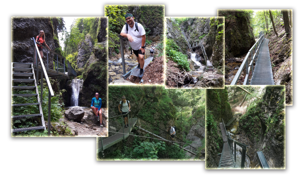 | Gdy dojeżdżaliśmy do parkingu jeszcze padał deszcz, ale gdy ruszyliśmy na trasę wyszło słońce. Najpierw czekało nas przejście pięknym wąwozem – kładki, drabinki, łańcuchy i wodospady – same atrakcje. | |