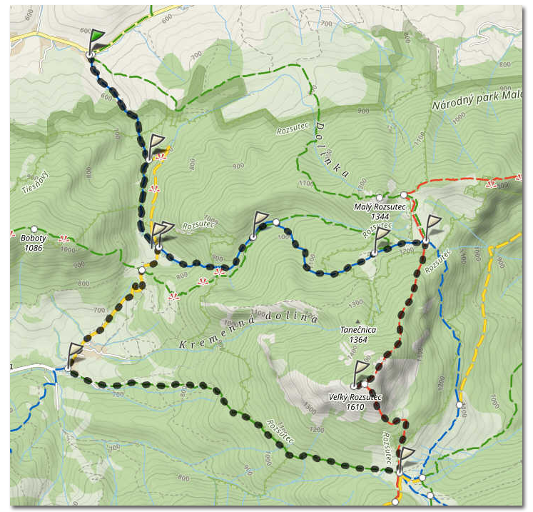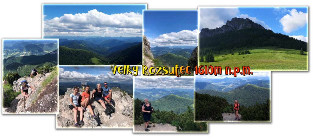 | Po wyjściu z wąwozu naszym oczom ukazały się dwa szczyty Mały i Wielki Rozsutec (po naszemu mały i wielki Cyc lub Sutek). My dogorywaliśmy na polance, a w tym czasie Monia z Renią machały nam z Małego Rozuteca, którego generalnie nie było dzisiaj w planie. Potraktowaliśmy ten szczyt jako próg zwalniający dla naszych strusi pędziwiatrów. | |